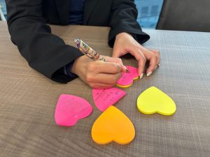 今回の企画では、勤労感謝の日(11月23日)にちなんで、日頃の感謝の気持ちをかたちにして伝え合うことをテーマに、ハート型の付箋に感謝のメッセージを書いて、ハート型の台紙に貼り付けて大きなハートアートとして掲示する取り組みを行いました。